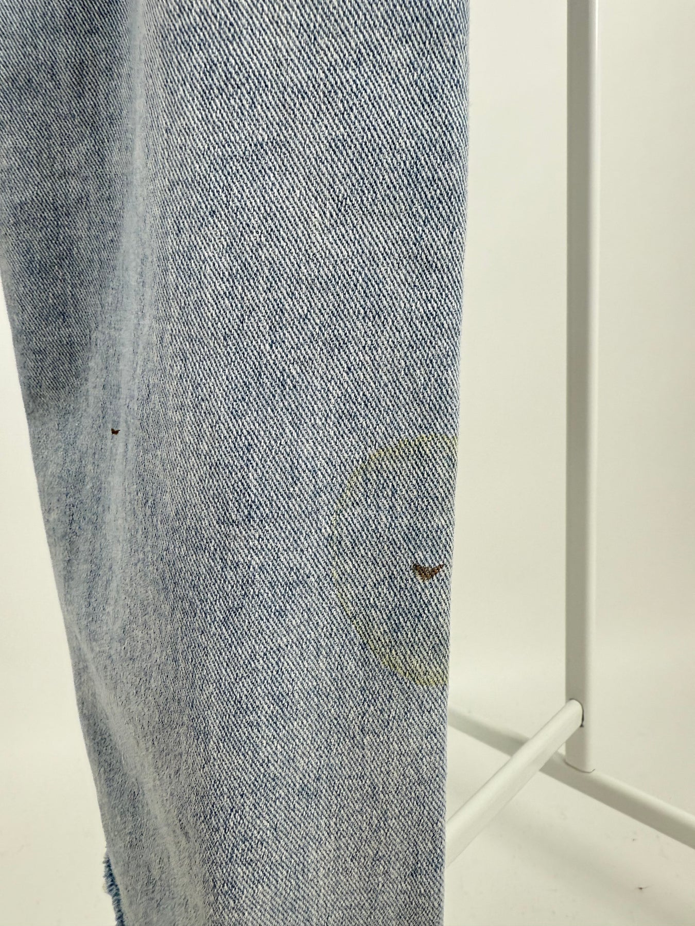 • Fleck am rechten Hosenbein unten (siehe Bild)