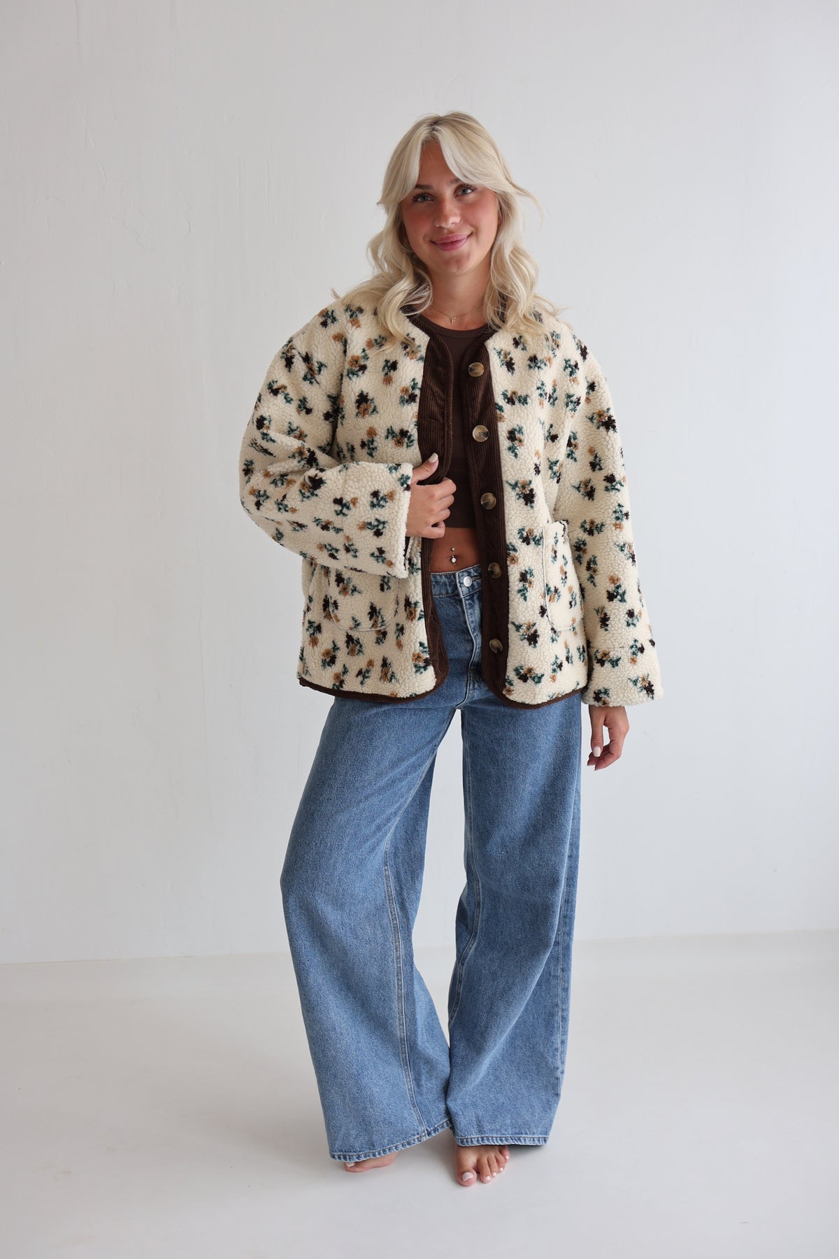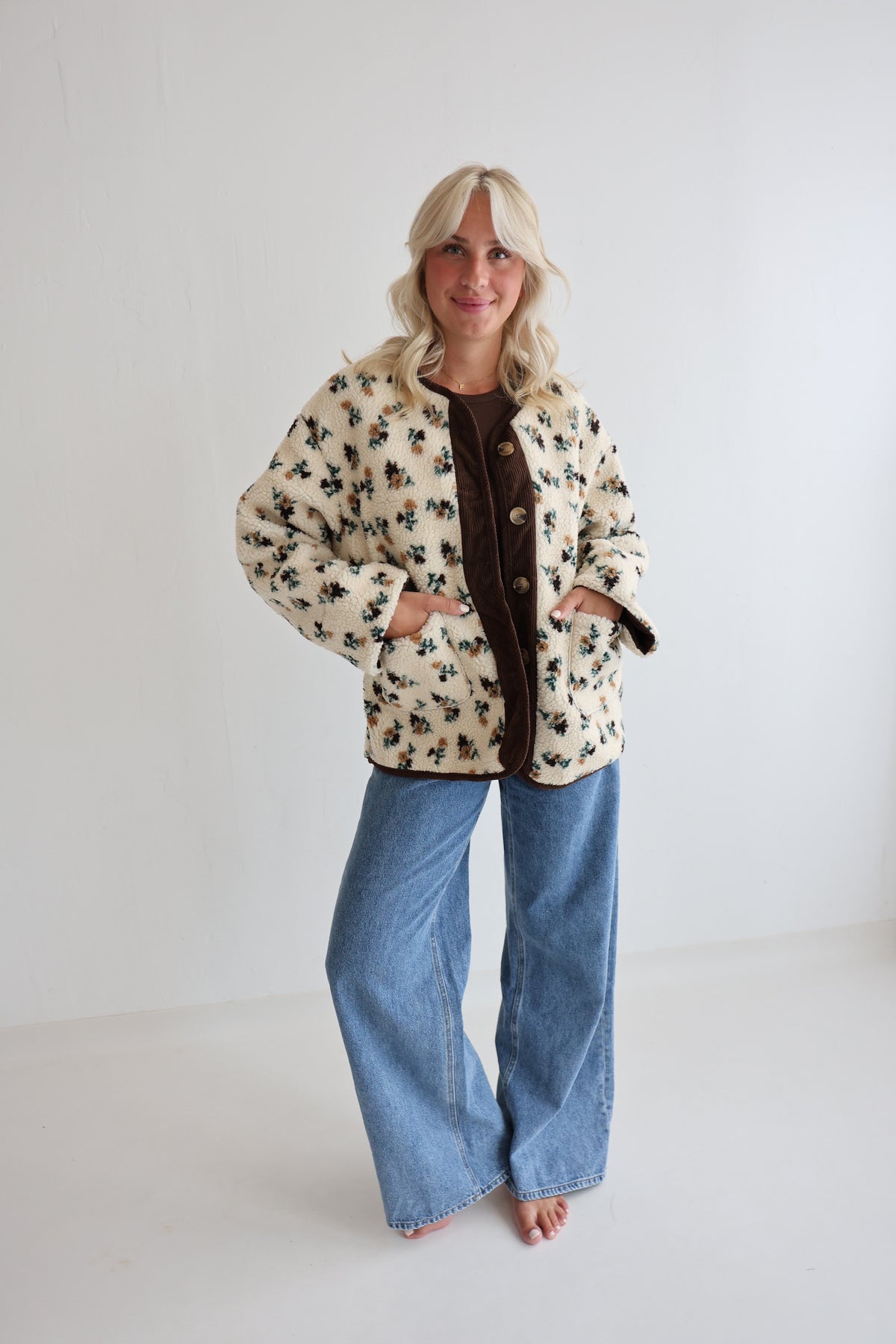 • Super schöne Jacke in Teddyoptik mit Floralprint und braunem Cordeinsatz